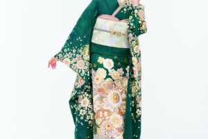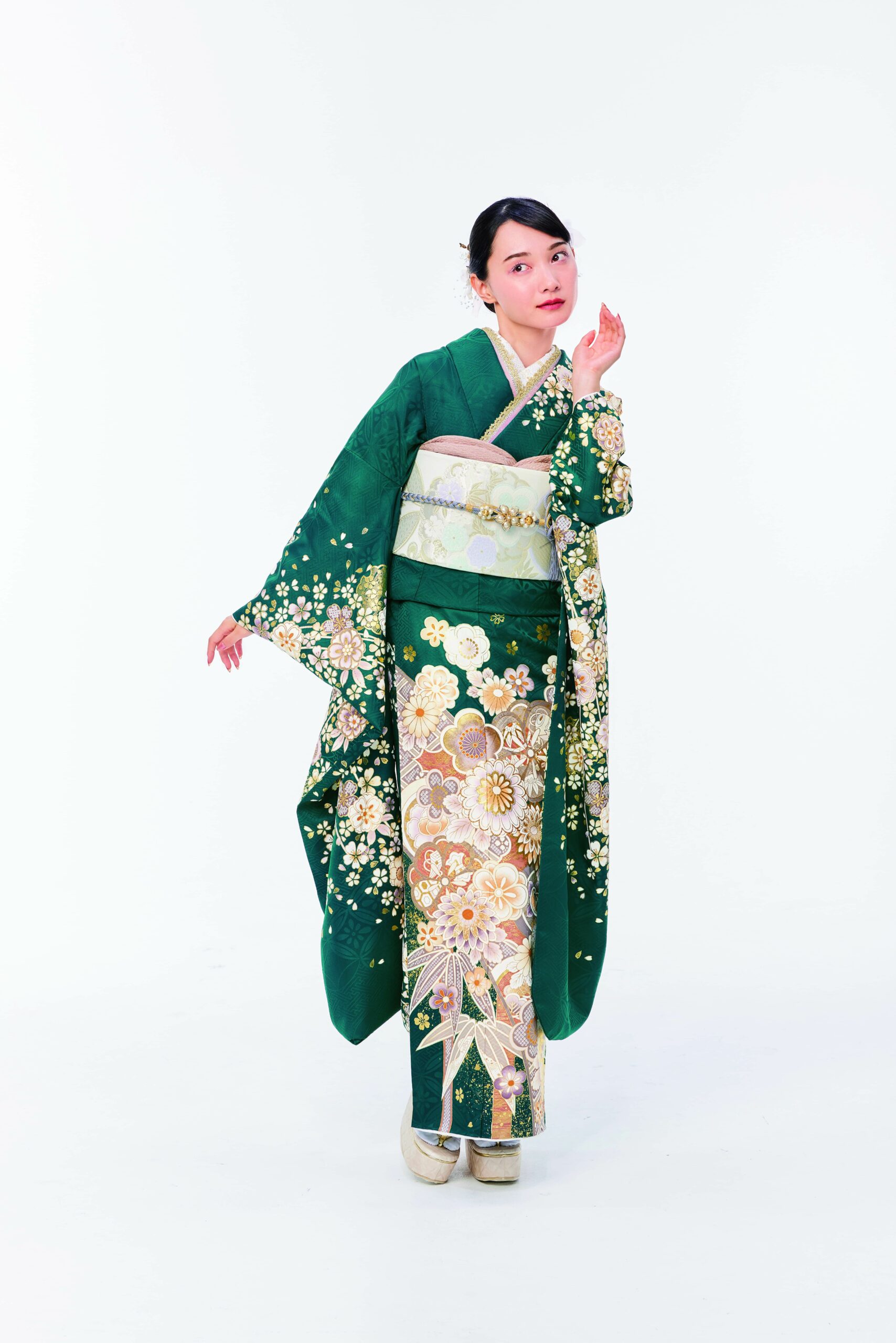 深みのある緑地に、古典的な花意匠が美しく映えるこの振袖は、不変の王道柄として成人式で間違いなく注目を集める一枚。